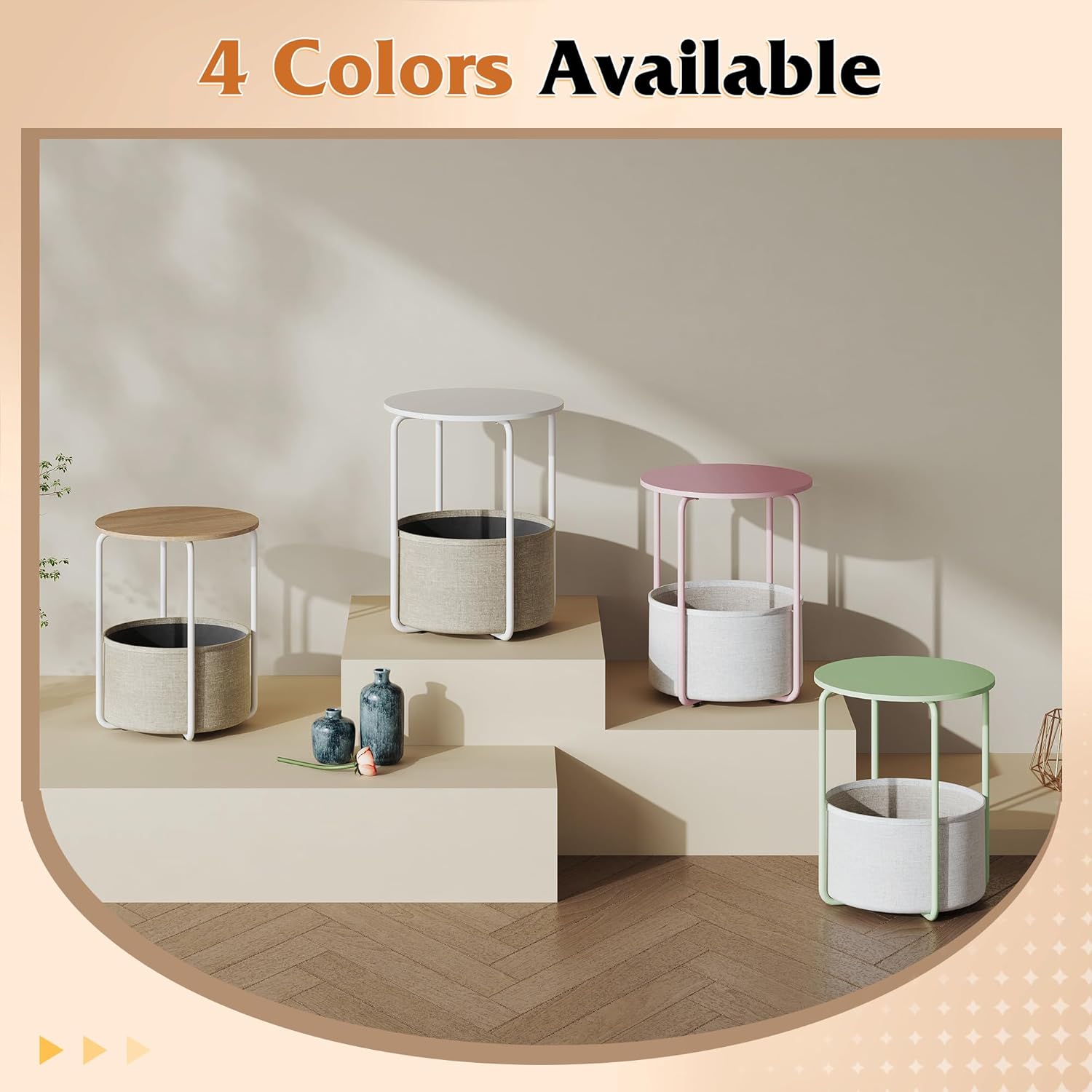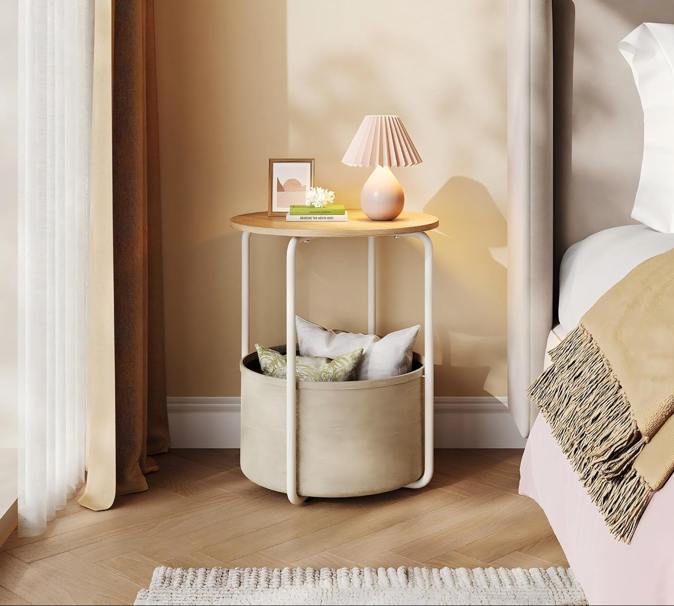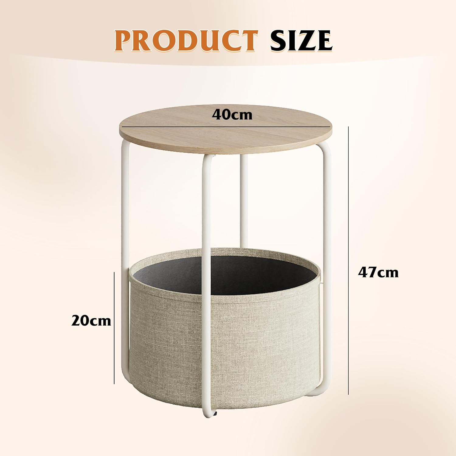 Built with a sturdy steel frame and a smooth wooden tabletop, this bedside table also includes a convenient fabric storage basket for books, magazines, or personal items. Its modern industrial look makes it a versatile piece for bedrooms, living rooms, dorms, or cozy reading corners.