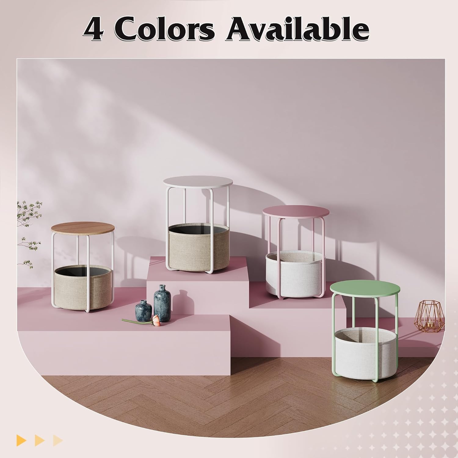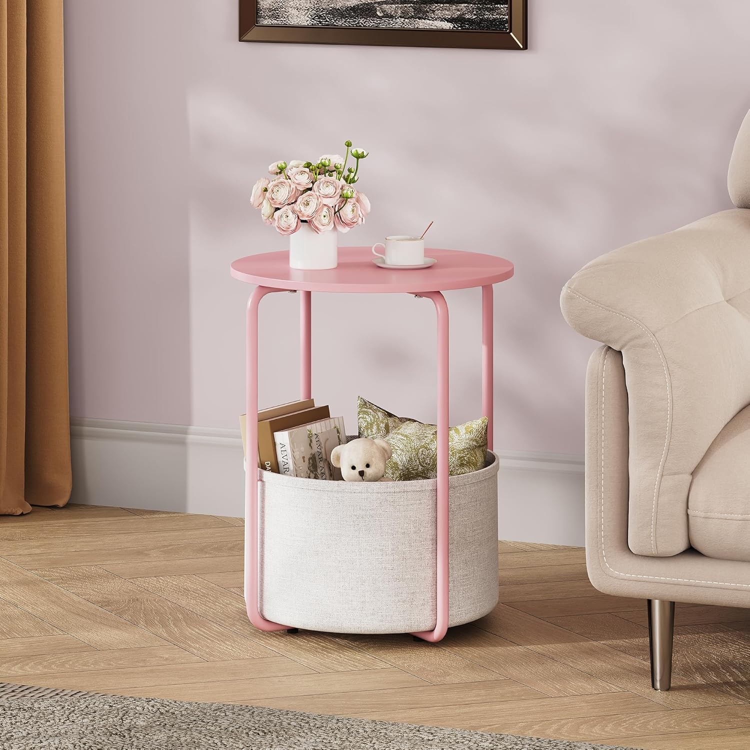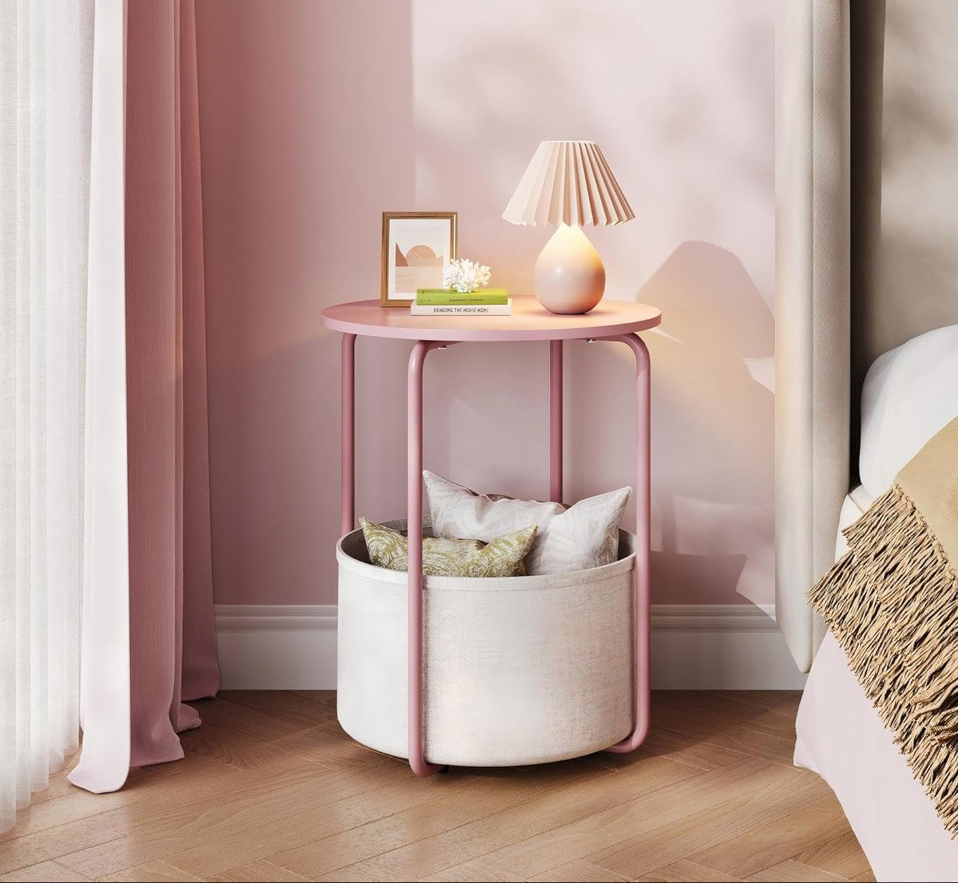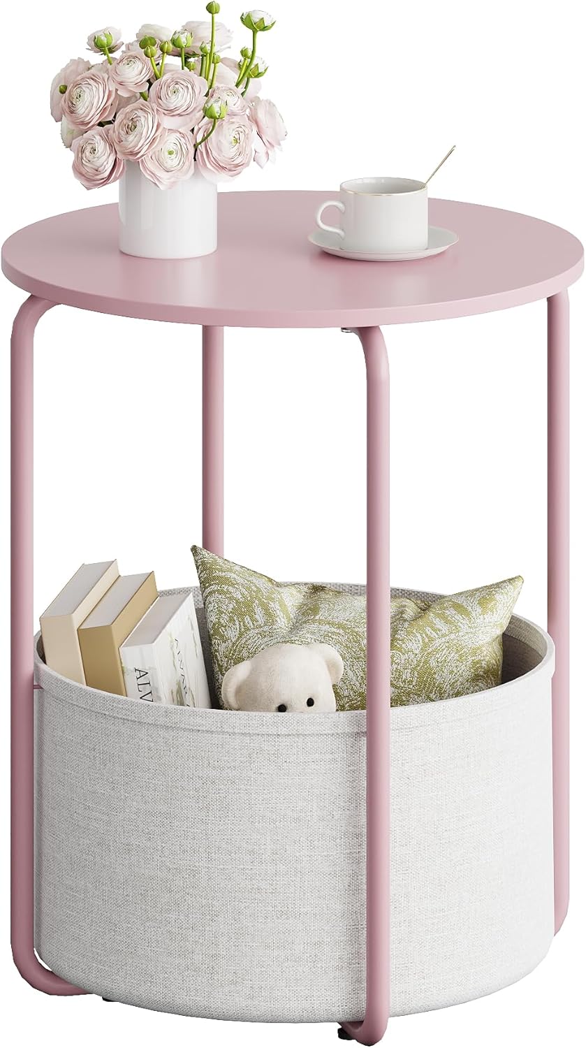 Built with a sturdy steel frame and a smooth wooden tabletop, this bedside table also includes a convenient fabric storage basket for books, magazines, or personal items. Its modern industrial look makes it a versatile piece for bedrooms, living rooms, dorms, or cozy reading corners.