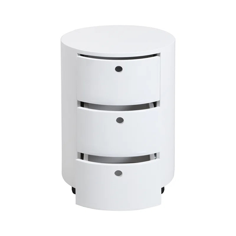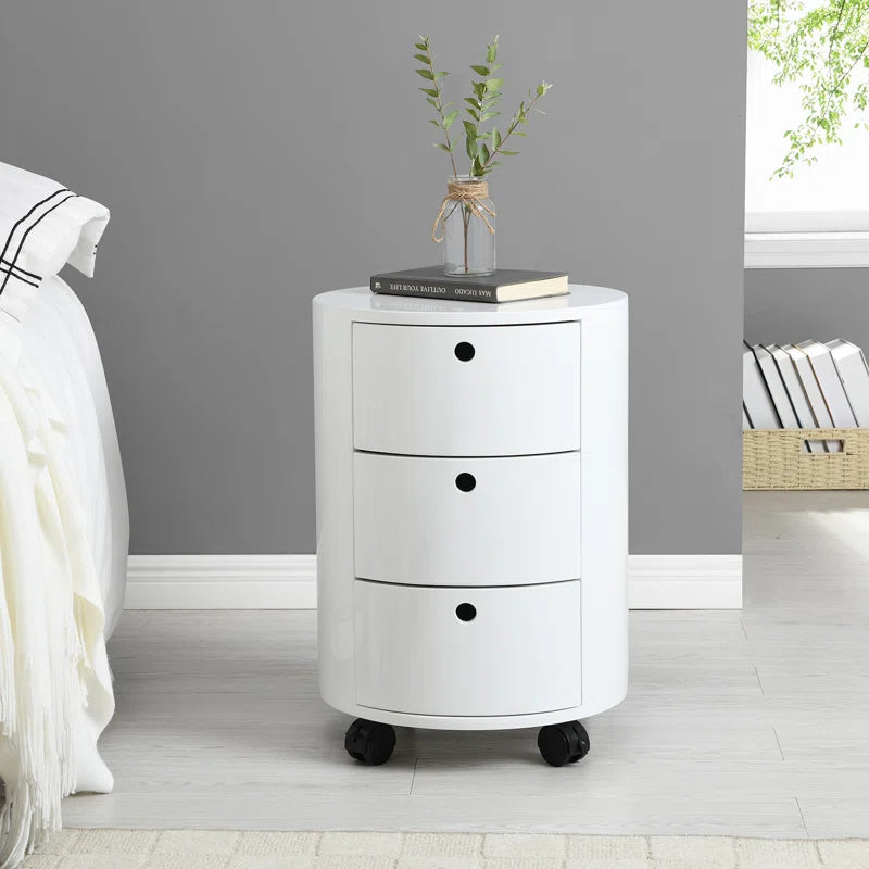 The Isla Modern Round Rolling 3-Drawer Bedside Table is a stylish and practical storage solution designed for contemporary living spaces. Featuring a sleek curved silhouette and a clean white finish, this bedside table adds a modern touch while blending effortlessly with a variety of décor styles. Its compact round design makes it ideal for placement beside your bed or sofa without overwhelming the space.