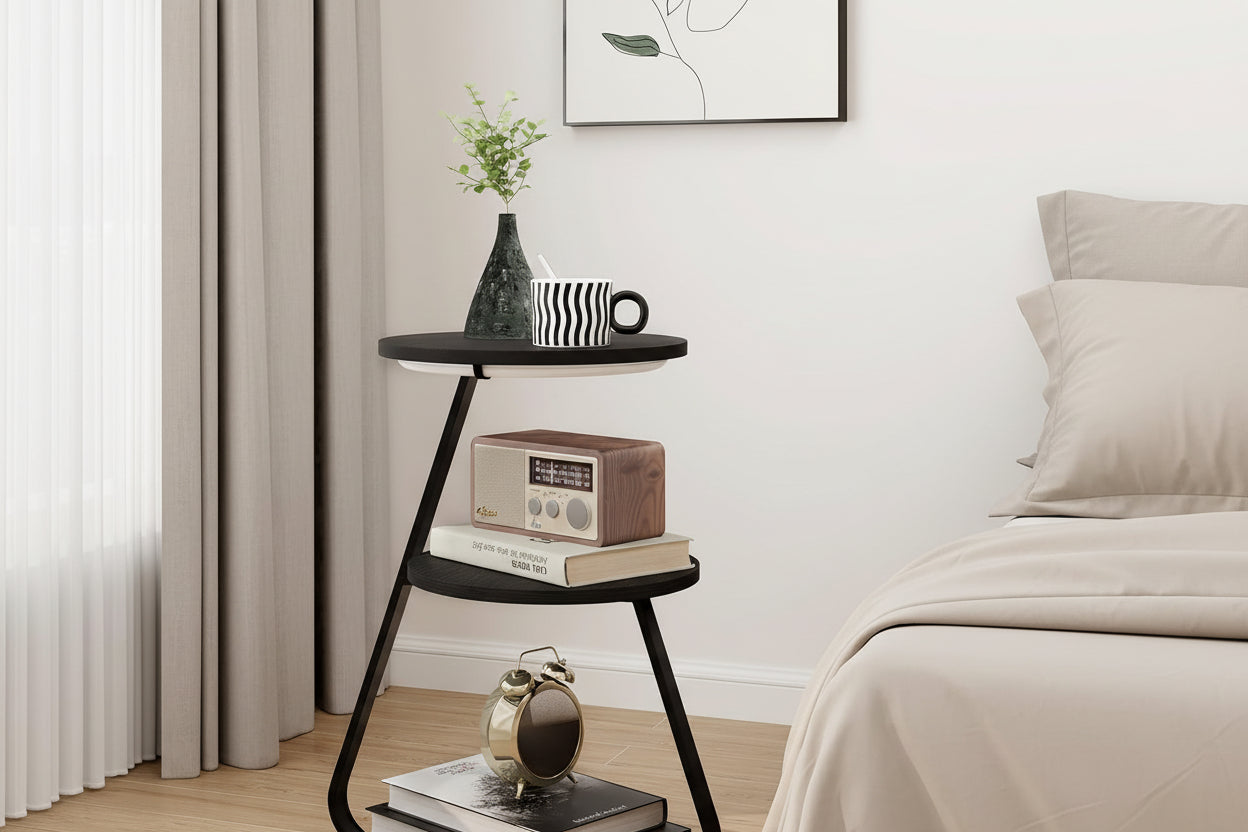 The Vale 3-Tier Round Bedside Table – Black combines modern style with smart functionality, making it a versatile addition to bedrooms, living rooms, and study spaces. Its sleek black finish and round silhouette create a contemporary look that fits effortlessly into a variety of interiors while taking up minimal floor space.